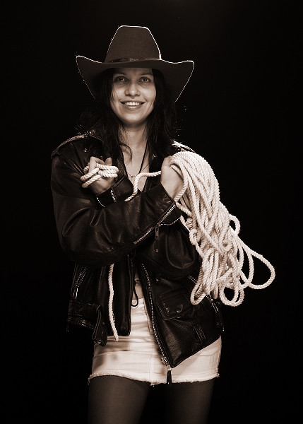 очень хорошо, резкие контуры шляпы играют с белой веревкой и юбочкой..