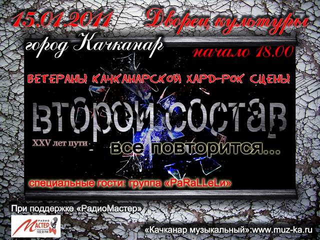 Будет совместный концерт двух качканарских рок-групп, "ParaLLeLi" и "Второй Состав". Каждая команда представит полноценную концертную программу.
