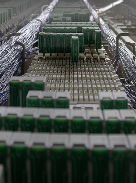 Если кого интересуют технические подробности: снято на "выносе" в 10-мк. Реально это все располагается вертикально по стене. Проводочки с одной стороны приходят от станции, с другой - уходят к абонентам. "Дома" - это разрядники, т.е. защита станции от высокого напряжения, если таковое вдруг появится в абонентской линии.