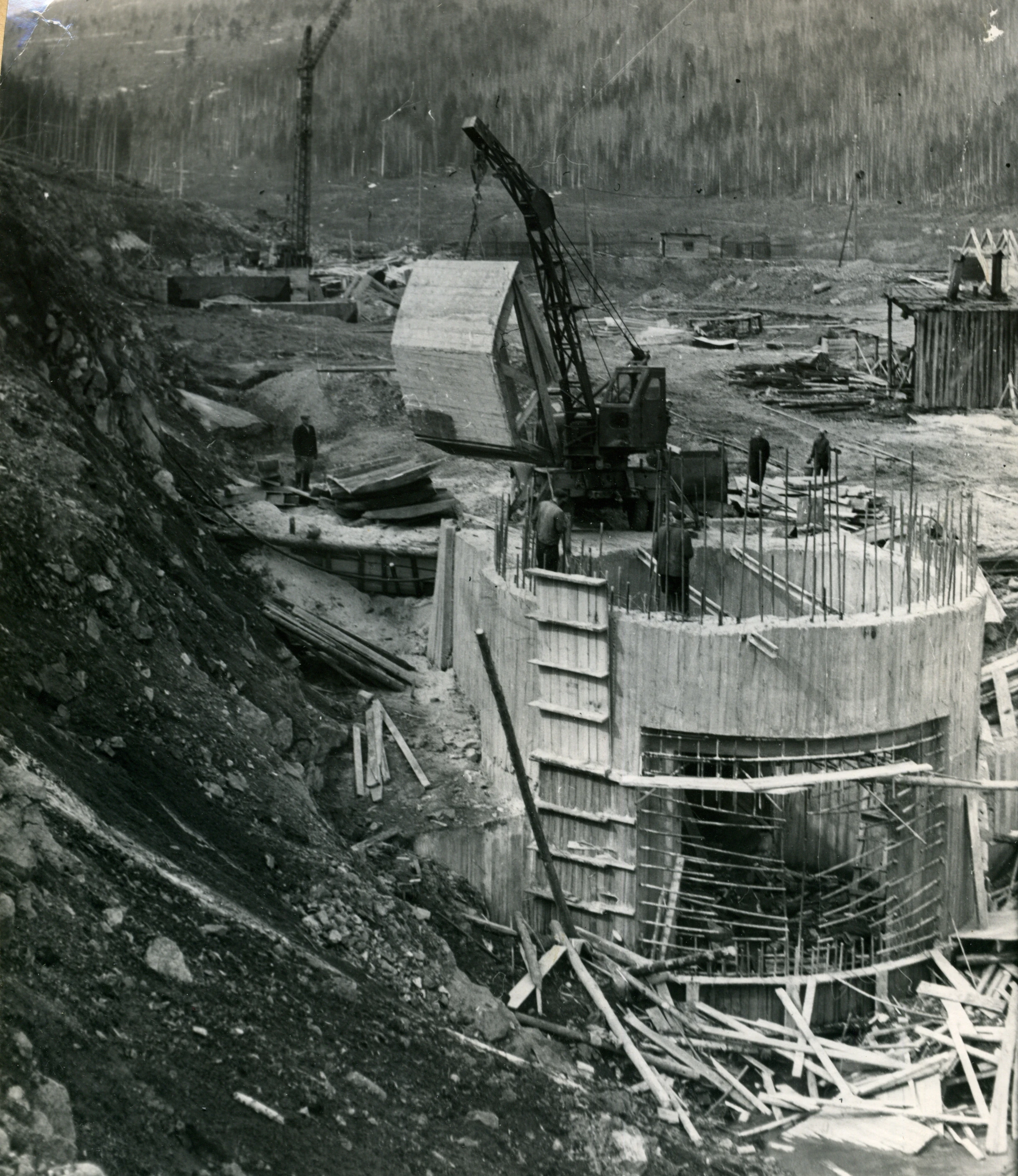 2026-03-19 17:30 Качканар Ретро1961 год. Нижне-выйская плотина. Cтроится башня №2 донного водоспуска. Изображение. Точная дата неизвестна, ориентировочно 1961 годИсточник:/archive/id283/